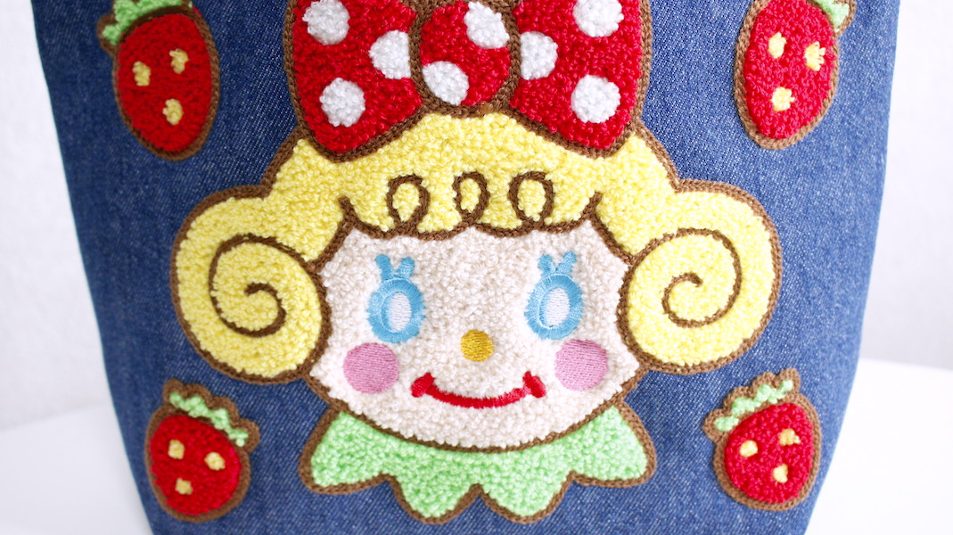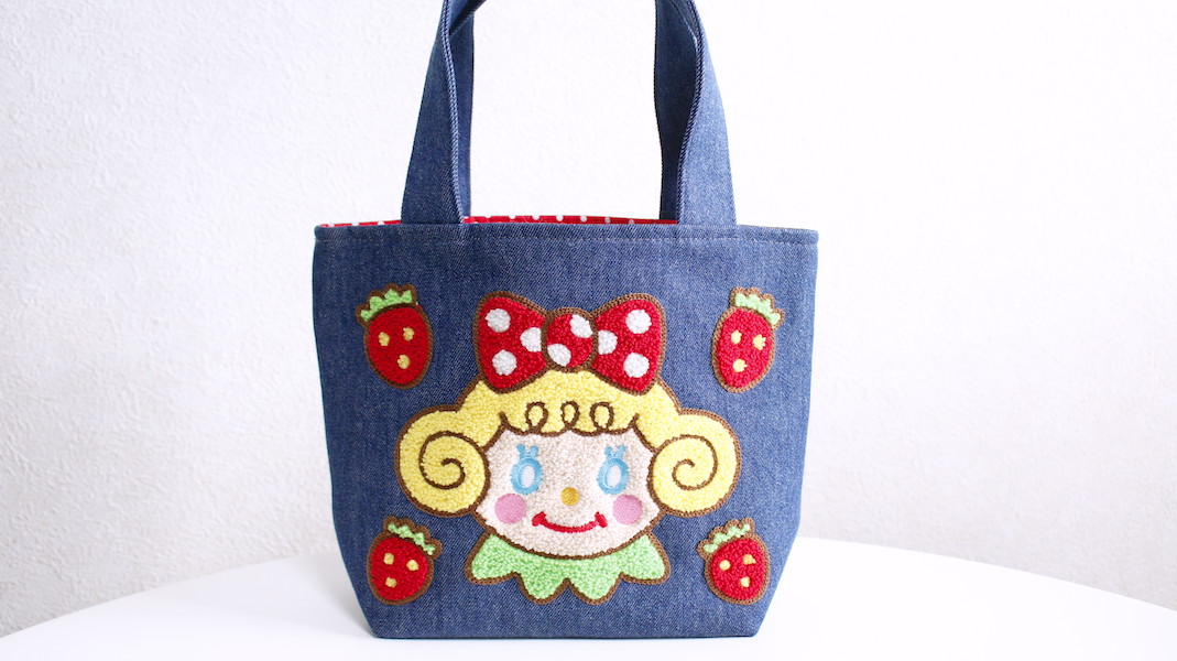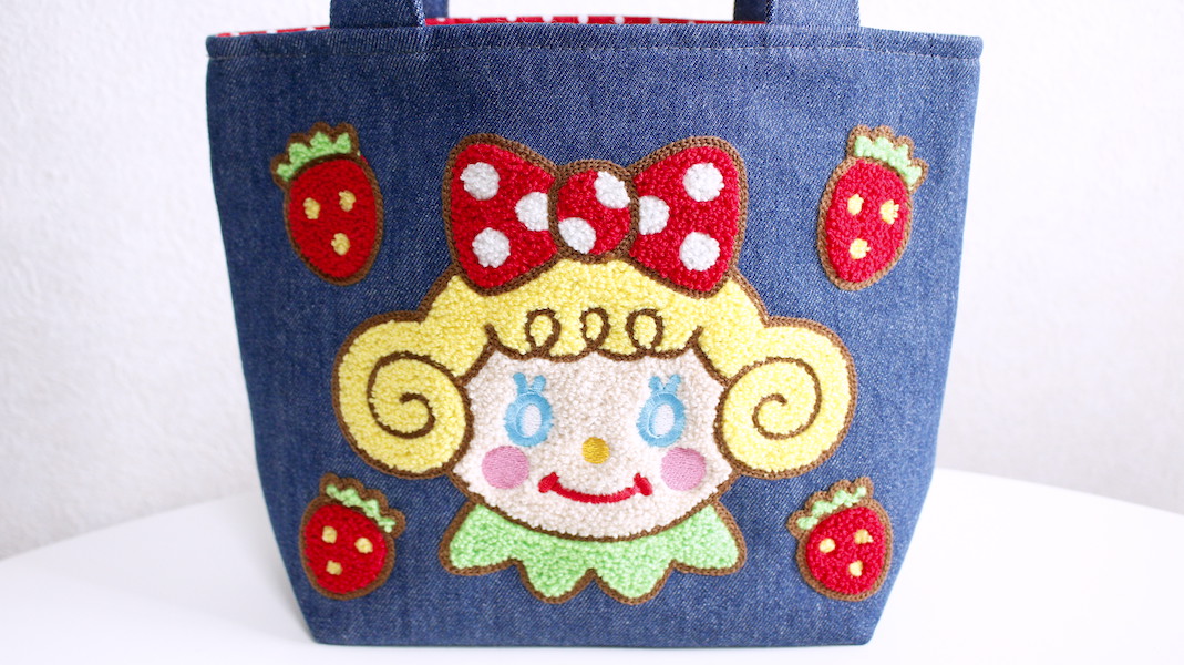 ぷくっとした立体感のさがら刺繍でお作りしたいちごちゃんのミニトート。