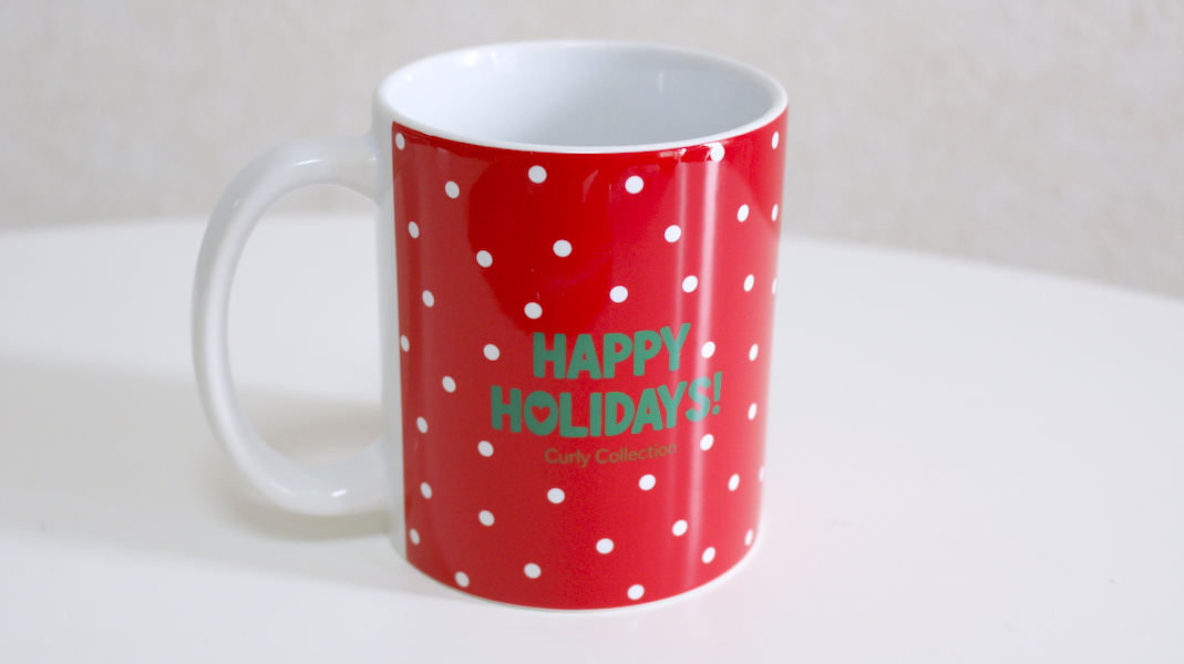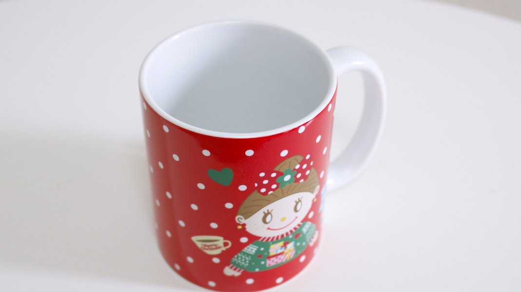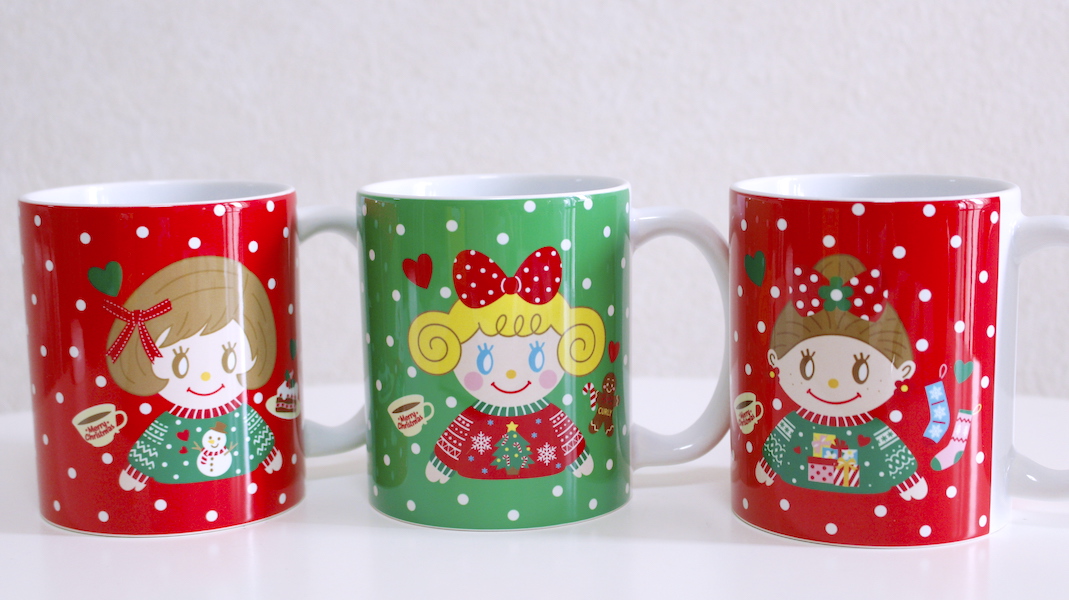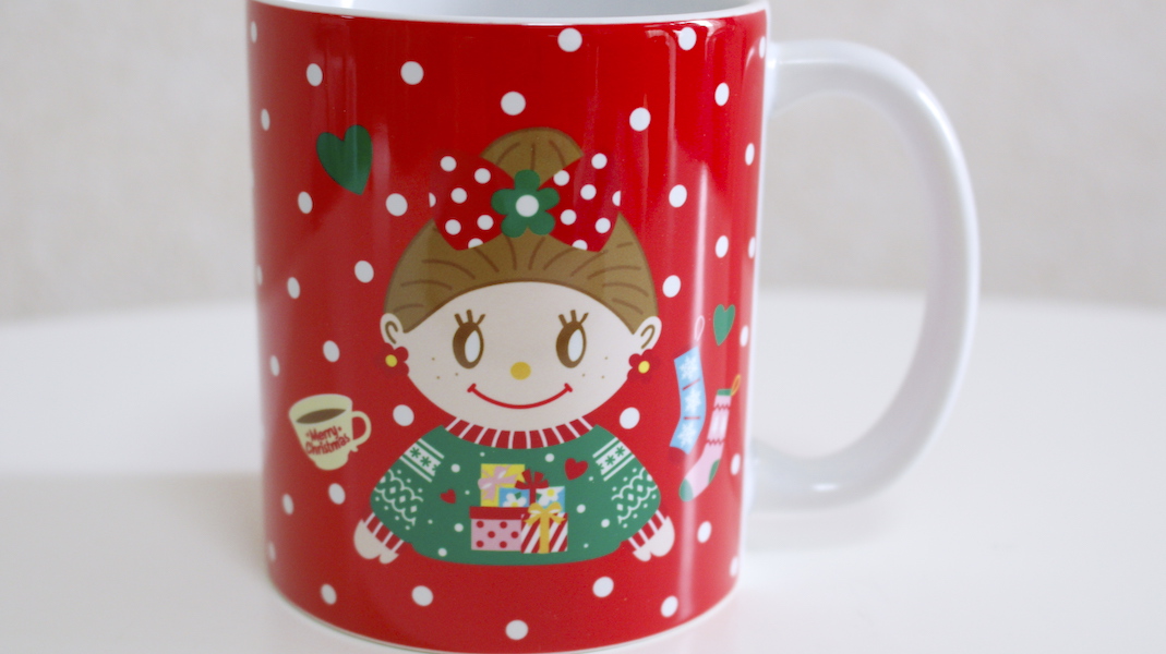 クリスマスのセーターを着たエヴィちゃんマグカップ。