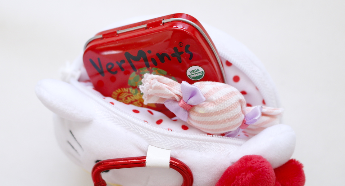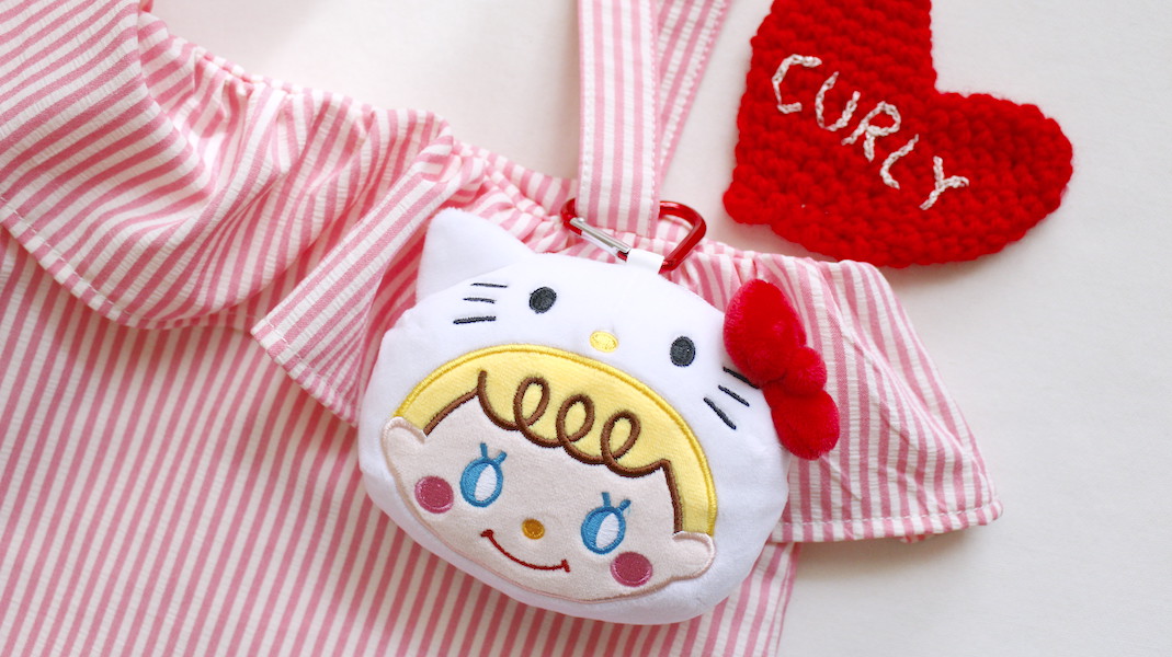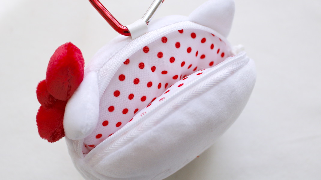 ハート形のカラビナ付きでカバンやリュックにつけられますよ。