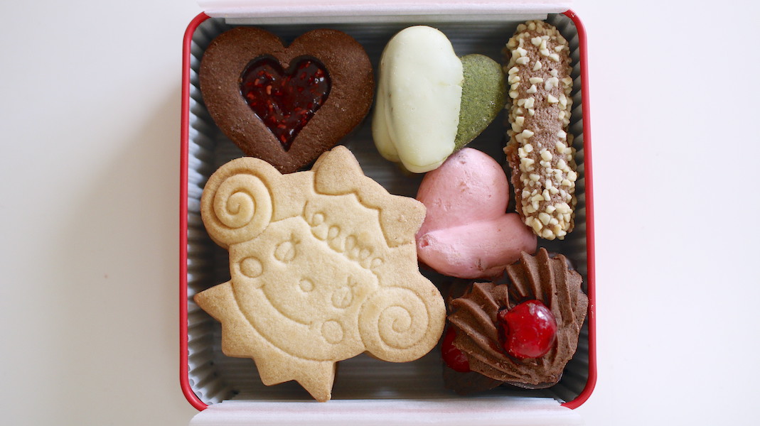 そして前回のクリスマス缶でも人気だったフランスの伝統的な焼き菓子バトンマレショーは、バレンタインをイメージしてチョコレートテイストに。