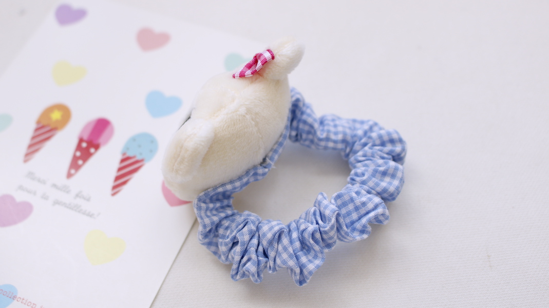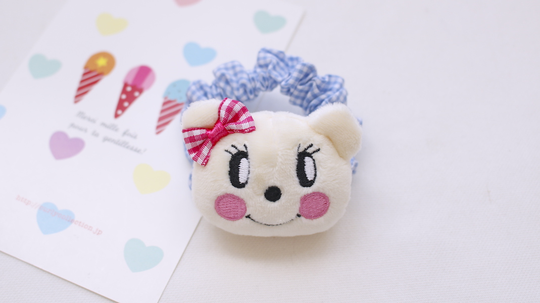 クマのマフィンちゃんのマスコットがついたシュシュ。