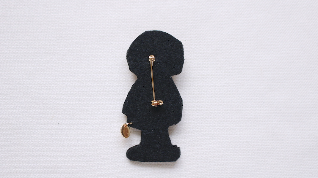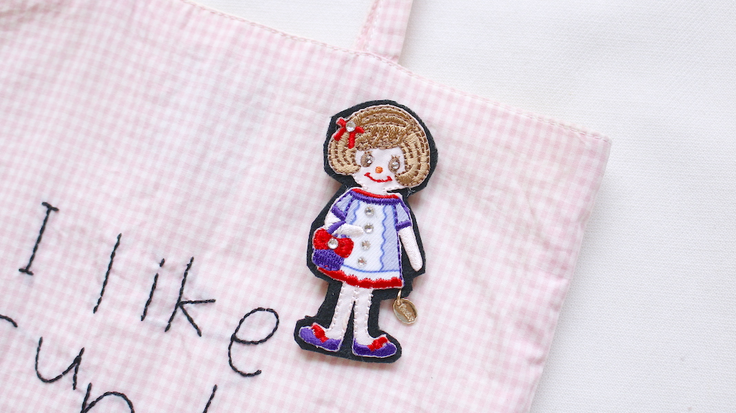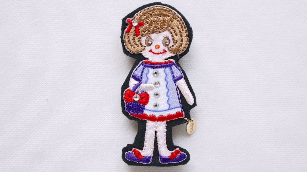 キラキラストーンをデコレーションしたワッペンブローチ。