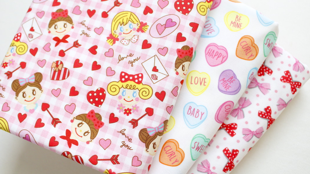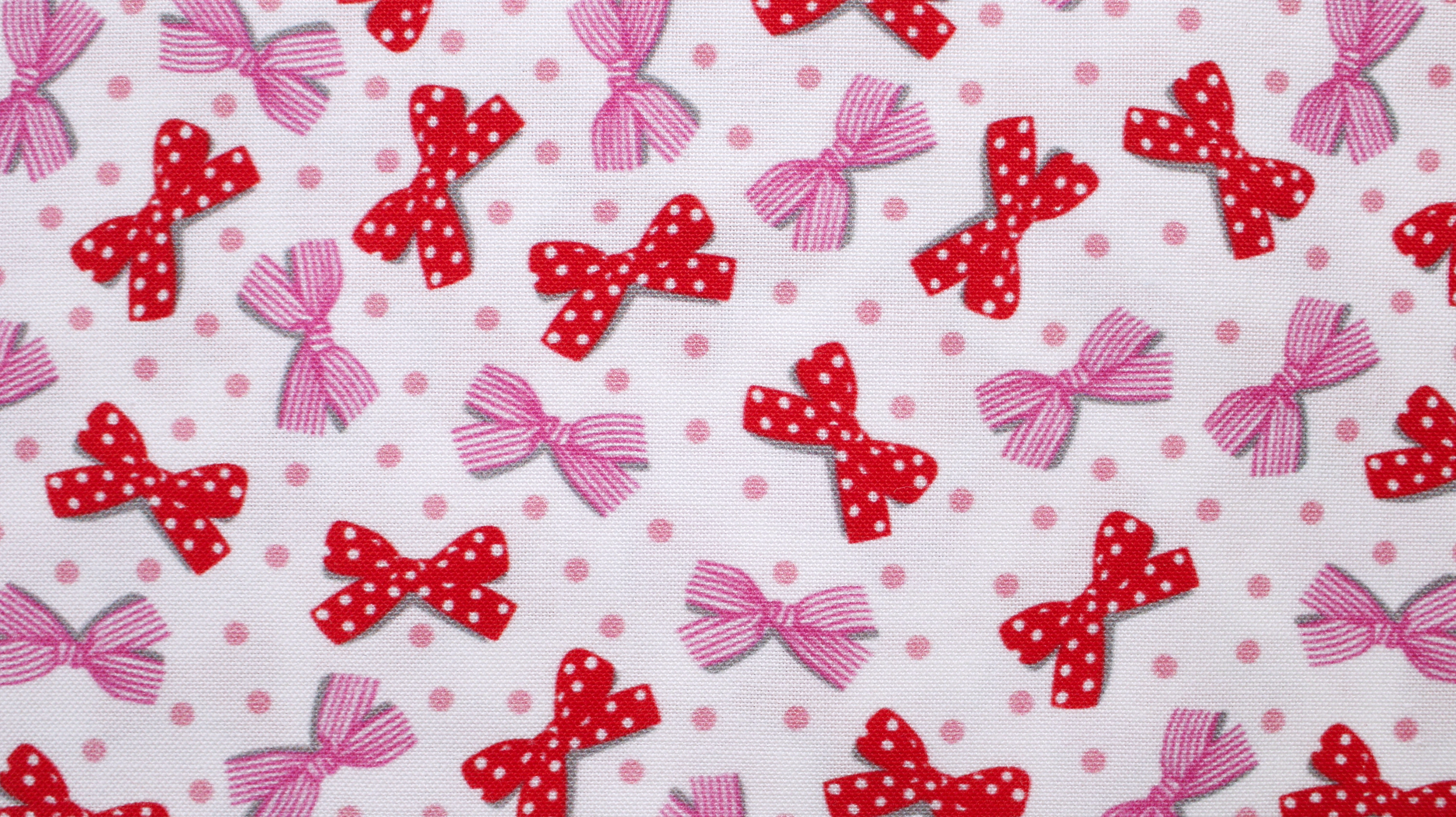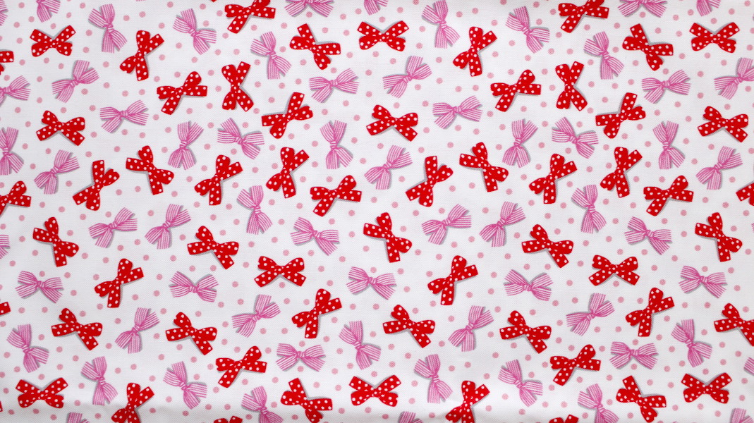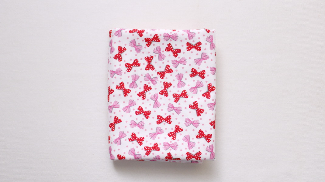 ホワイトベースに赤とピンクのリボンを散りばめたキュートな生地が完成。