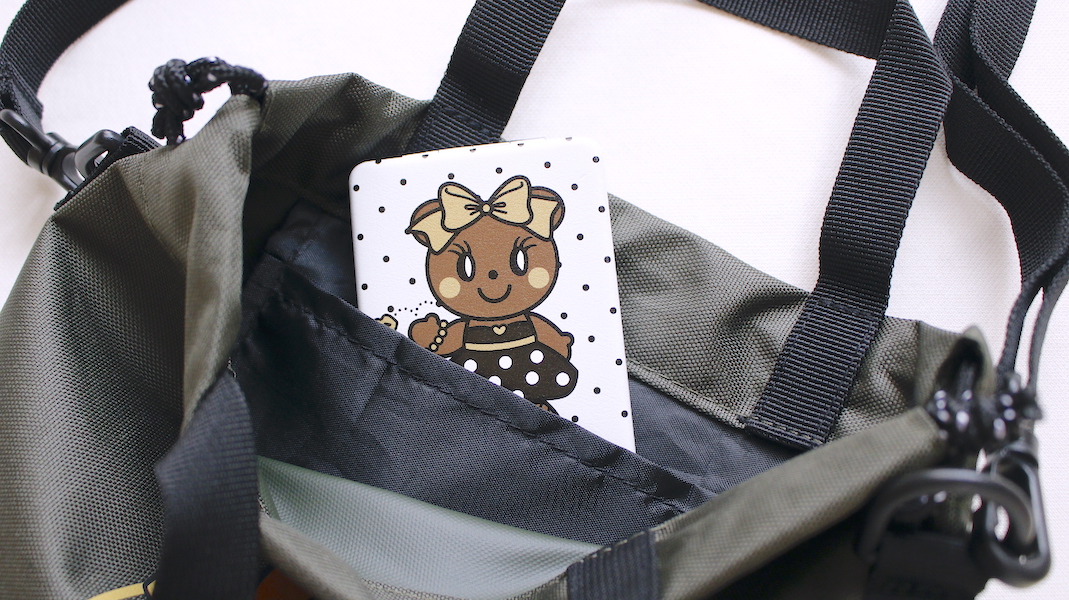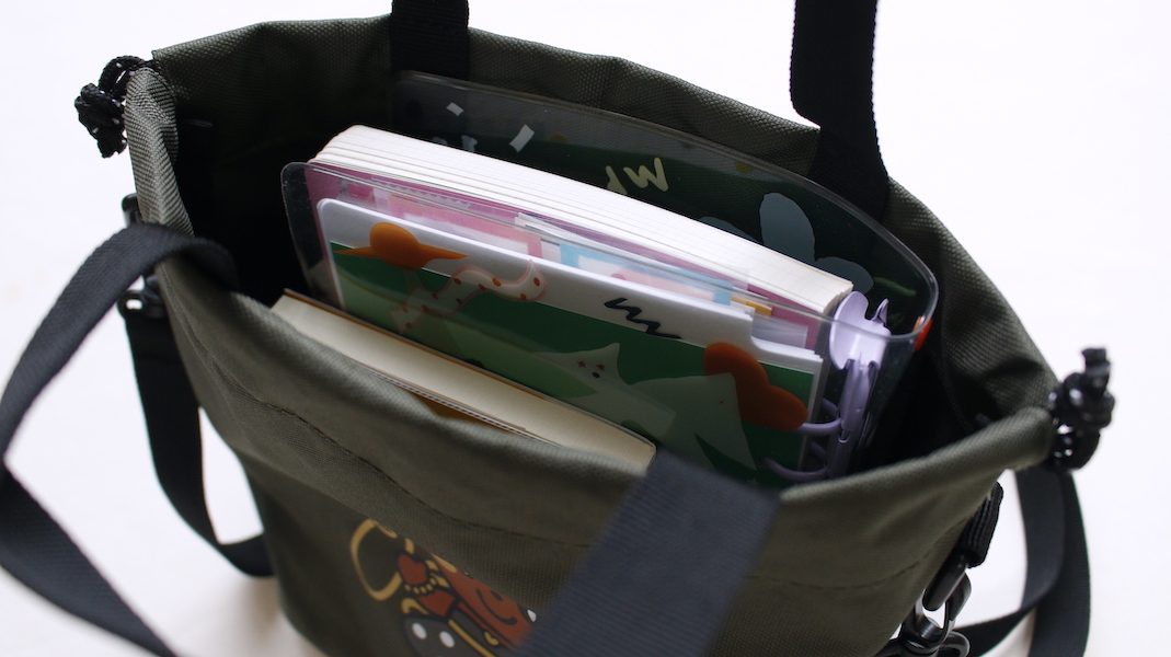 ちょっとしたお出かけに最適なコンパクトサイズで、ぎゅっと絞れるので中身が見える心配もありません。