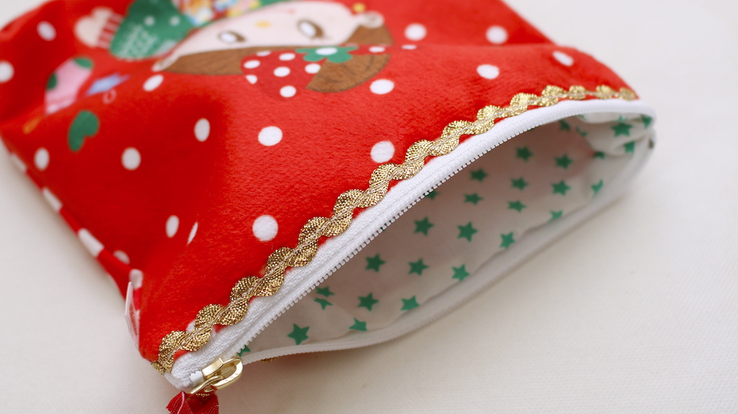 クリスマスのセーターを着たエヴィちゃんがプリントされたポーチ。