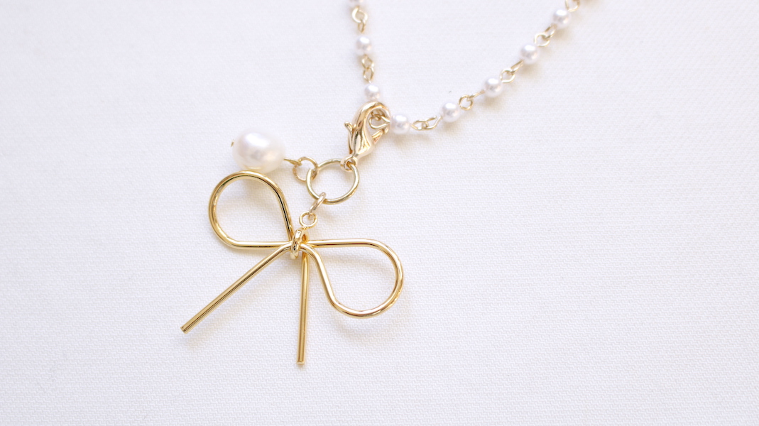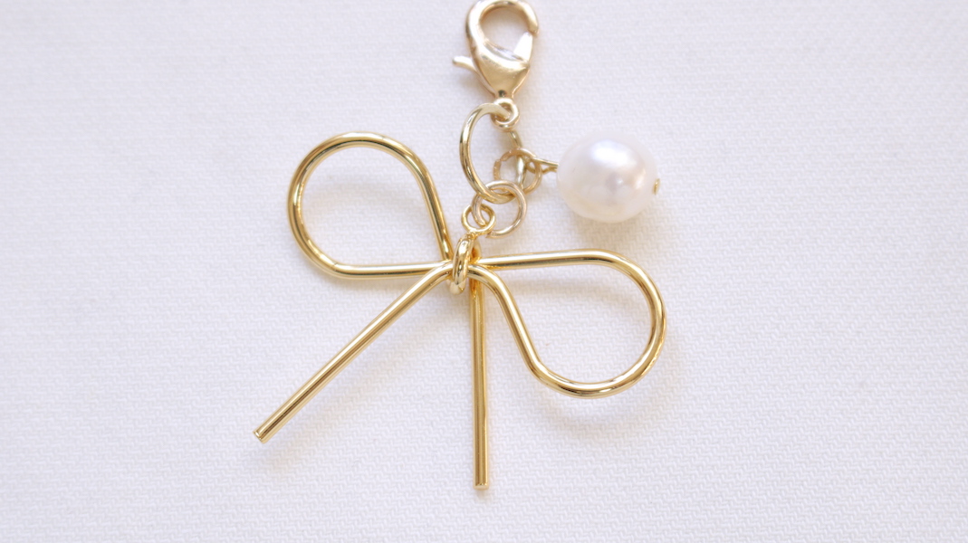 リボンやパールを重ねて合わせたファスナーチャーム。