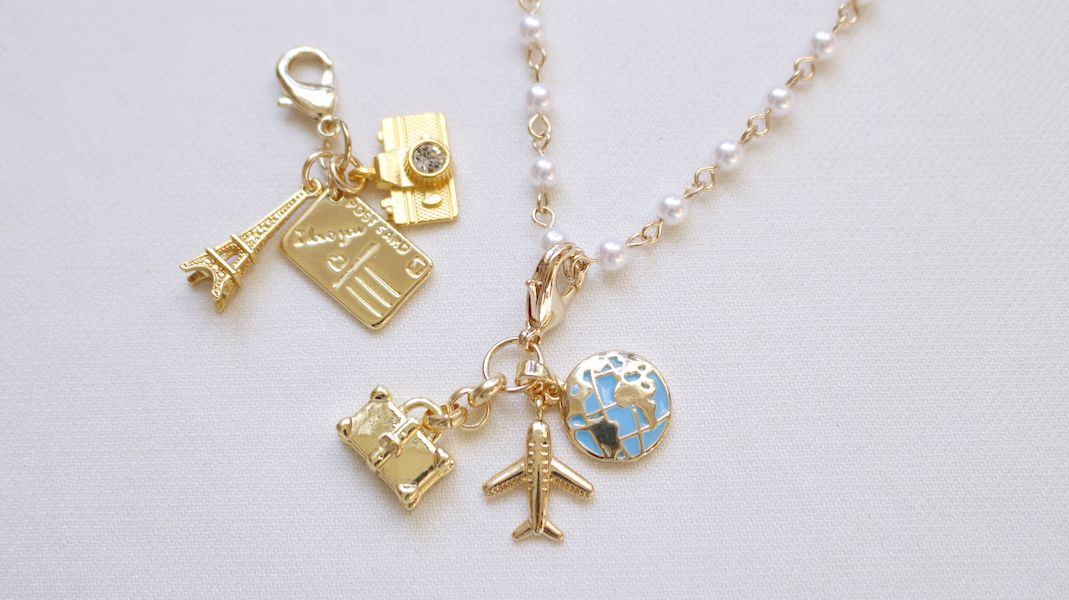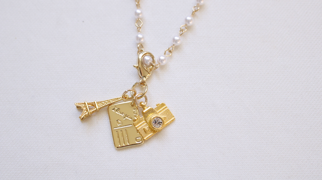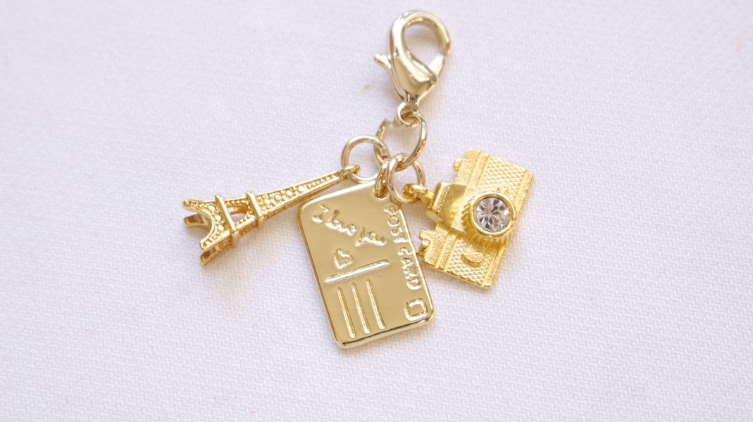 パリのバカンスをテーマに、エッフェル塔やカメラのパーツを重ねたファスナーチャーム。
