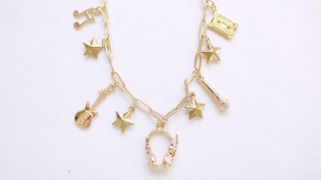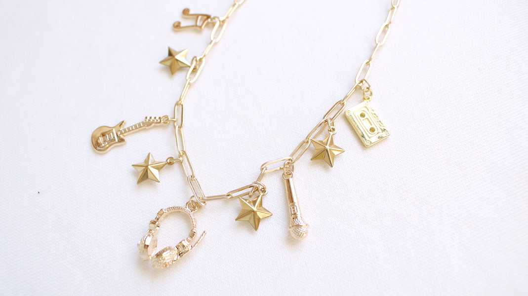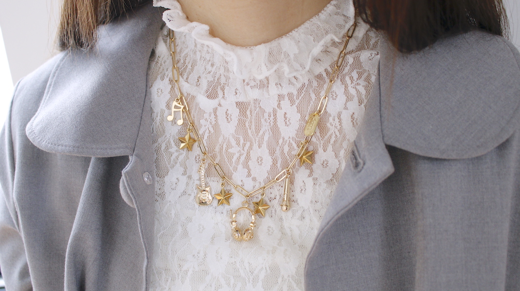 音楽モチーフの様々なパーツをバランス良くコラージュした存在感のあるネックレス。