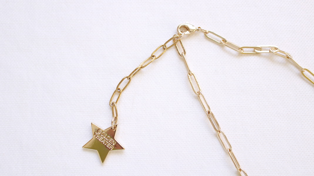 シンプルなTシャツやカットソー、ブラウスの襟元からチラリと見せるだけで、華やかな印象に。
